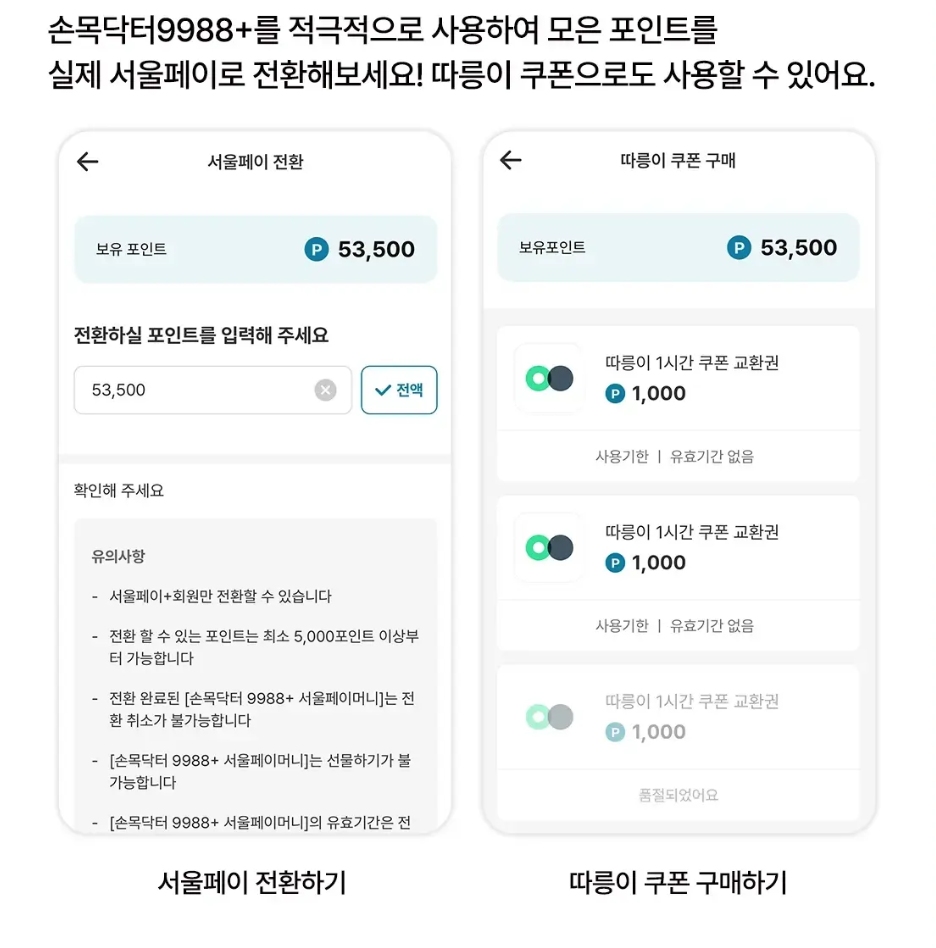 - 포인트 부족 시: 서울페이 상품권(손목닥터9988 워치상품권, 서울사랑상품권)으로 추가 결제가 가능하며 포인트 사용 후 차액은 본인이 부담합니다.