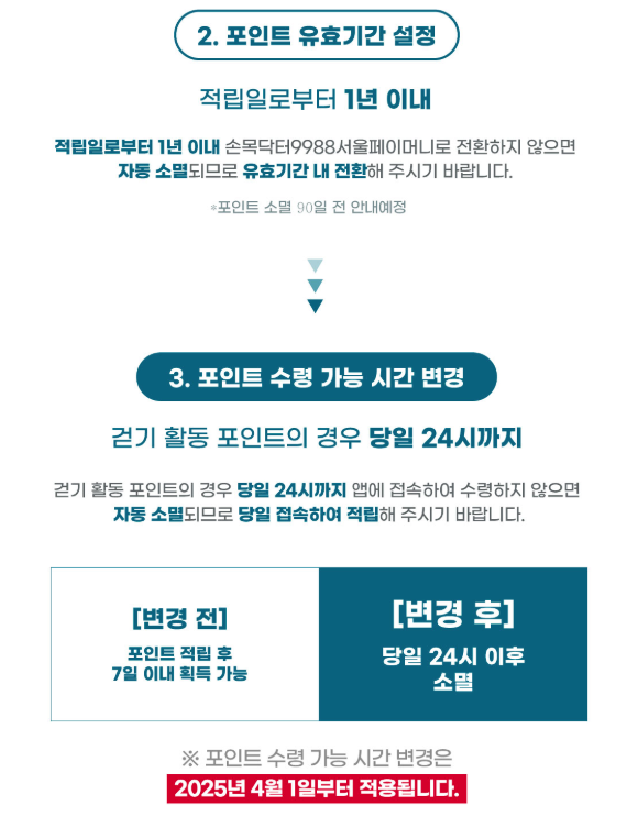 손목닥터9988에서는 사용자의 활동에 따라 포인트를 적립할 수 있습니다. 2025년 3월 21일부터 포인트 적립 항목과 포인트 유효기간 등이 변경됩니다. 어떻게 변하는지 지금부터 알아보겠습니다.