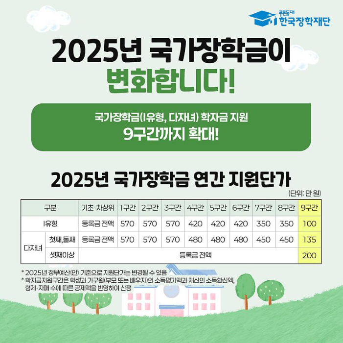 2025년부터 국가장학금 지원 대상이 기존 소득 8구간(중위소득 200%) 이하에서 9구간(중위소득 300%) 이하로 확대되었습니다.
