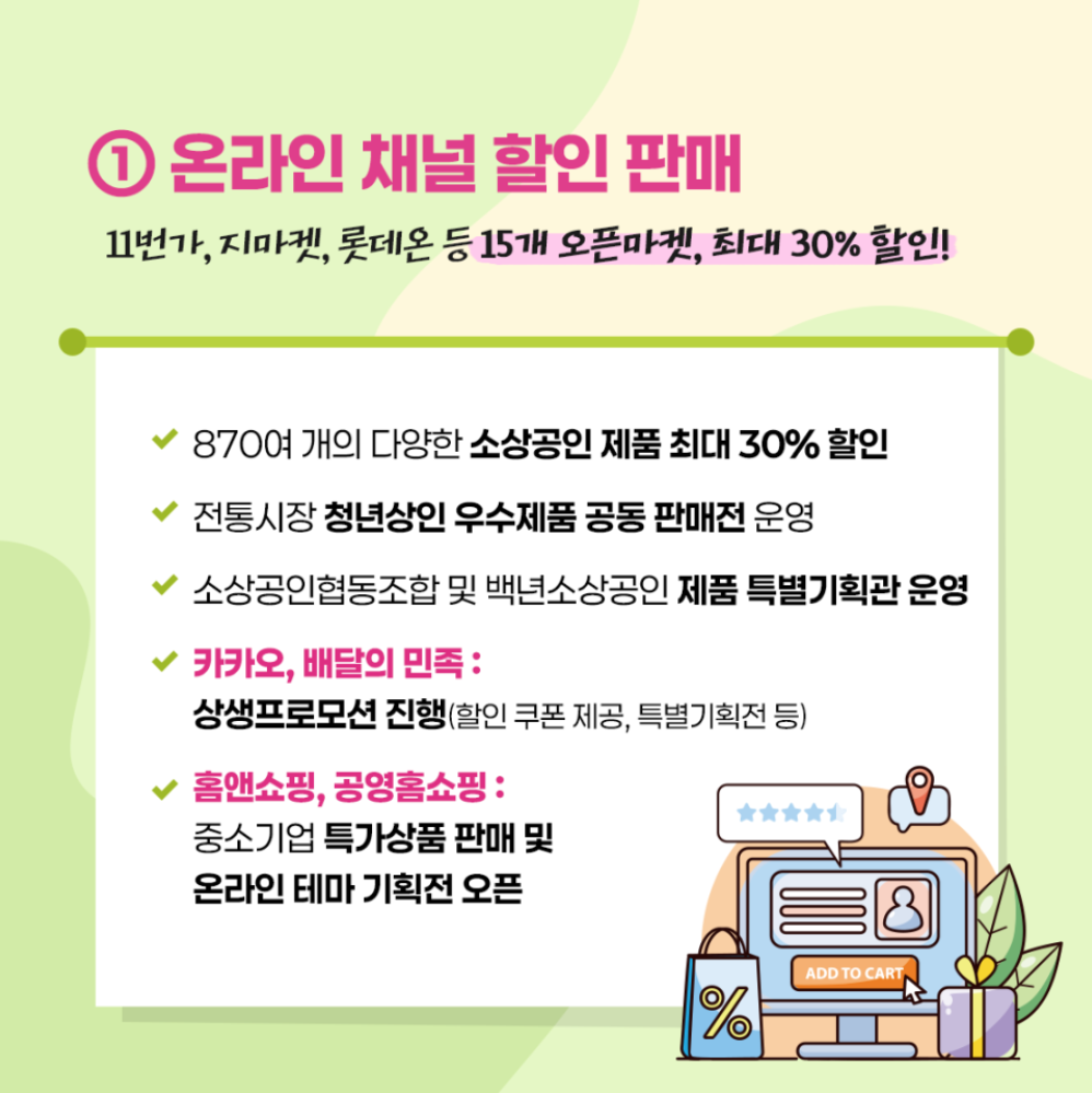 전통시장 청년상인 우수제품 공동판매전과 소상공인 협동조합 및 백년소상공인 제품 특별기획관을 운영하고, 소담스퀘어(8곳)와 민간 3개사(SK스토아, 그립, 오아시스)에서 라이브커머스를 통해 우수 소상공인 제품을 최대 30% 할인 판매합니다.