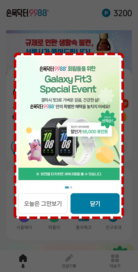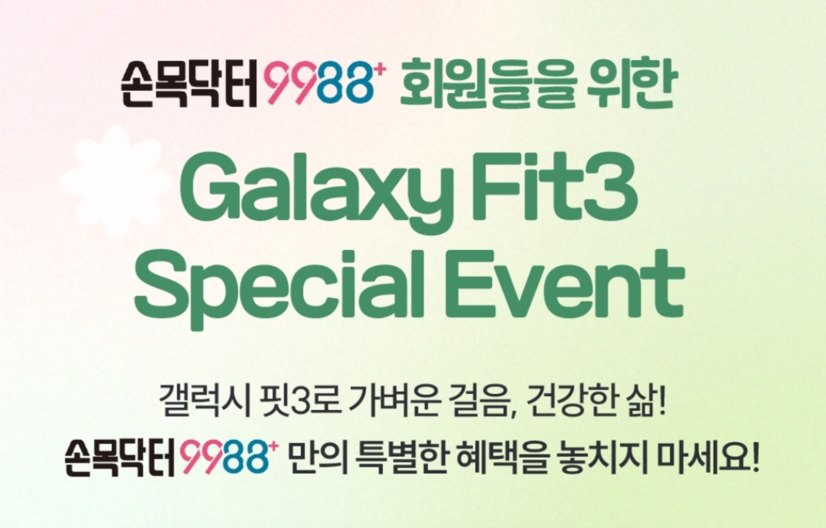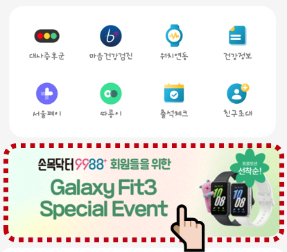 - 손목닥터9988 앱 접속: 앱 내 '갤럭시 핏3 스페셜 이벤트' 배너를 클릭합니다.