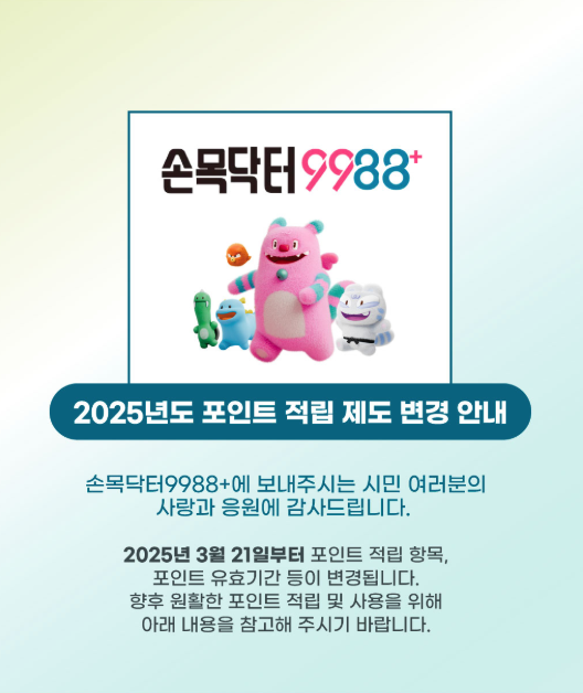 손목닥터9988에서는 사용자의 활동에 따라 포인트를 적립할 수 있습니다. 2025년 3월 21일부터 포인트 적립 항목과 포인트 유효기간 등이 변경됩니다. 어떻게 변하는지 지금부터 알아보겠습니다.