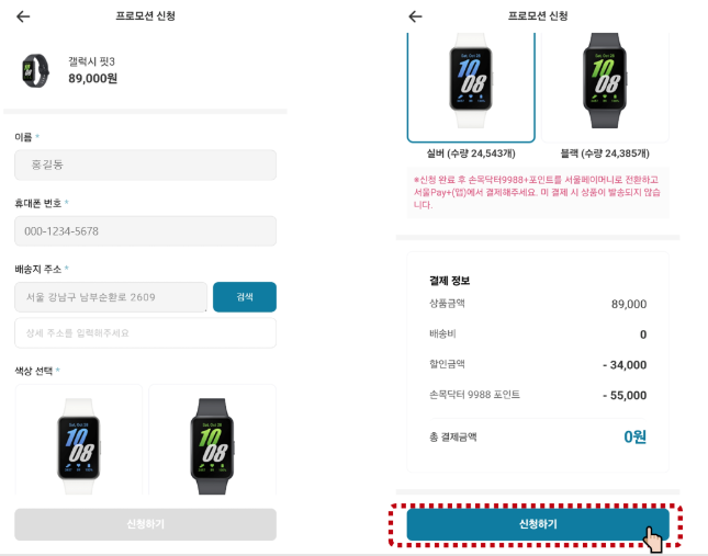- 신청서 작성: 이름, 연락처, 배송 주소 등을 입력하고 원하는 색상을 선택합니다.