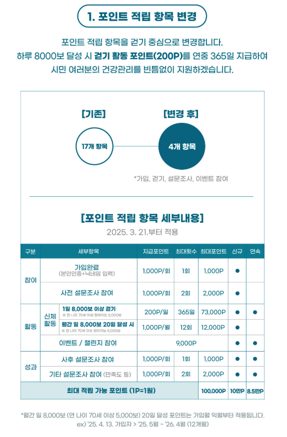 - 1일 8,000보 이상 걷기(70세 이상 참여자는 5,000보 이상) : 200P / 일